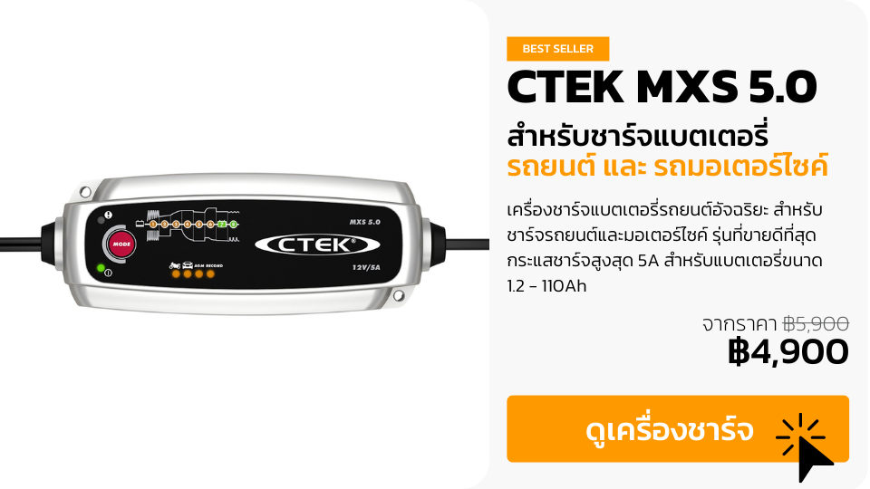 โดยรุ่นที่แนะนำคือ CTEK MXS 5.0 เครื่องชาร์จที่เหมาะกับทั้งรถยนต์และมอเตอร์ไซค์ รวมถึงรถยนต์ไฟฟ้า (EV) คุณสมบัติเด่น:
