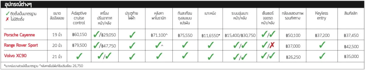 คุณจะพบของออปชั่นมากมายใน XC90 ส่วน Sport จะมีอุปกรณ์เพียงพอที่จะให้ความบันเทิง Cayenne ค่อนข้างมีอุปกรณ์น้อยเมื่อเทียบกัน