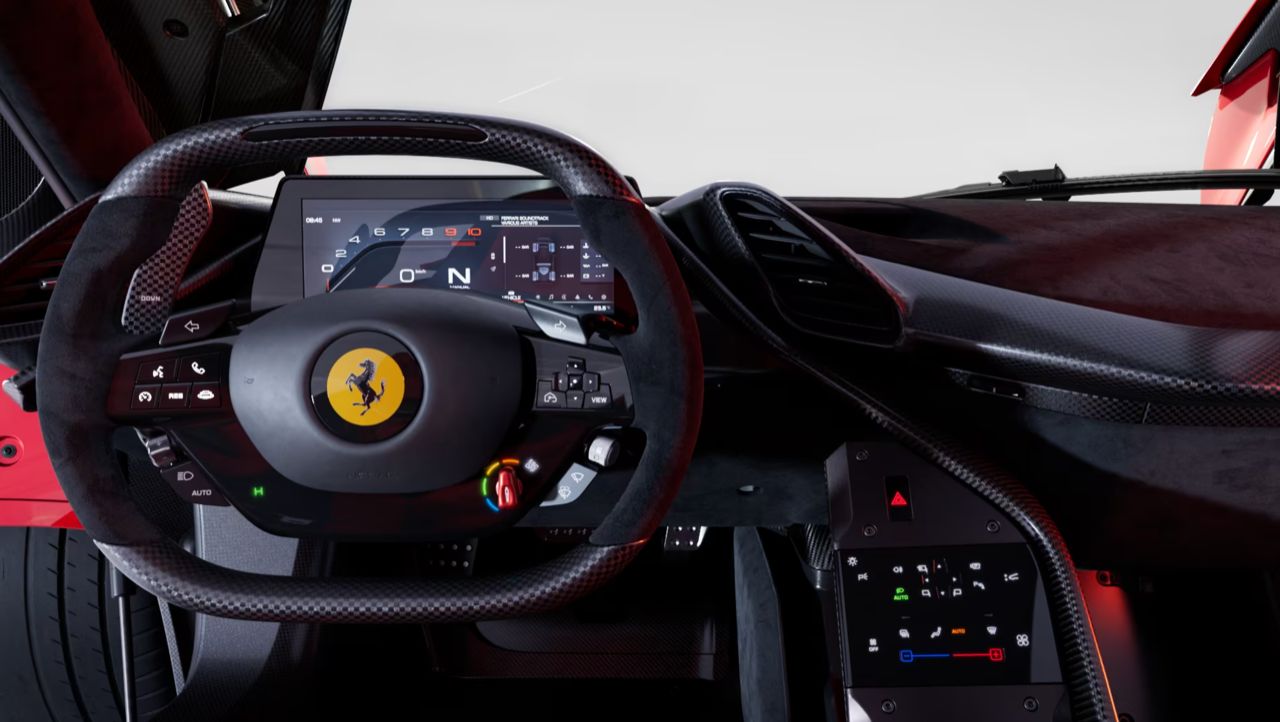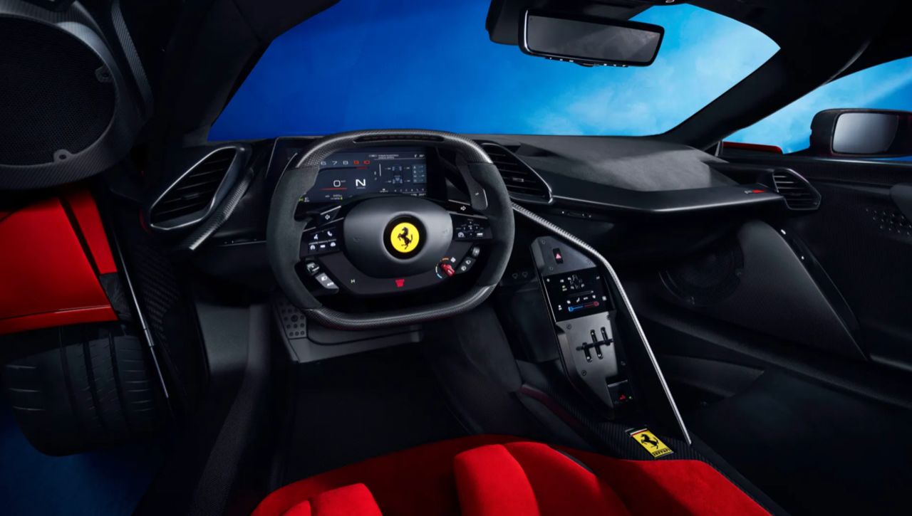 การออกแบบภายใน Ferrari ไม่เรียกว่า 2 ที่นั่ง แต่เรียกว่า 1+ คือตัวเบาะ แผงคอนโซล อุปกรณ์ต่างๆทำมาโดยโฟกัสให้กับคนขับ 100% ที่นั่งด้านข้างๆแทบไม่อยากเรียกว่าเบาะ จะพาใครนั่งไปด้วยยังเกรงใจ เบาะคนขับปรับเลื่อนได้ แต่เบาะ “+” หรือไอ้ส่วนเกินนั้น จะติดตายตัวขยับไม่ได้ ไม่อยากนั่งก็อย่านั่ง เบาะคนขับจะเยื้องมาข้างหน้ามากกว่า เพื่อให้ไหล่ไม่ถูไอ้ส่วนเกินเวลาขับ โดยที่ตัวเบาะทั้งคู่จะวางไว้ชิดกันมากกว่ารถปกติ ปุ่มบนพวงมาลัย เปลี่ยนจากปุ่ม Touch/Haptic แบนๆกดกิ๊กๆเบาๆใน 296 มาเป็นปุ่มแบบกดได้ลึกๆดั้งเดิม เพราะ Ferrari มองว่าตอนขับซัดตึงปุ่มแบบนี้คนขับได้รับ Feedback ชัดเจนกว่า กดแล้วรู้สึกว่าได้กดไปจริง