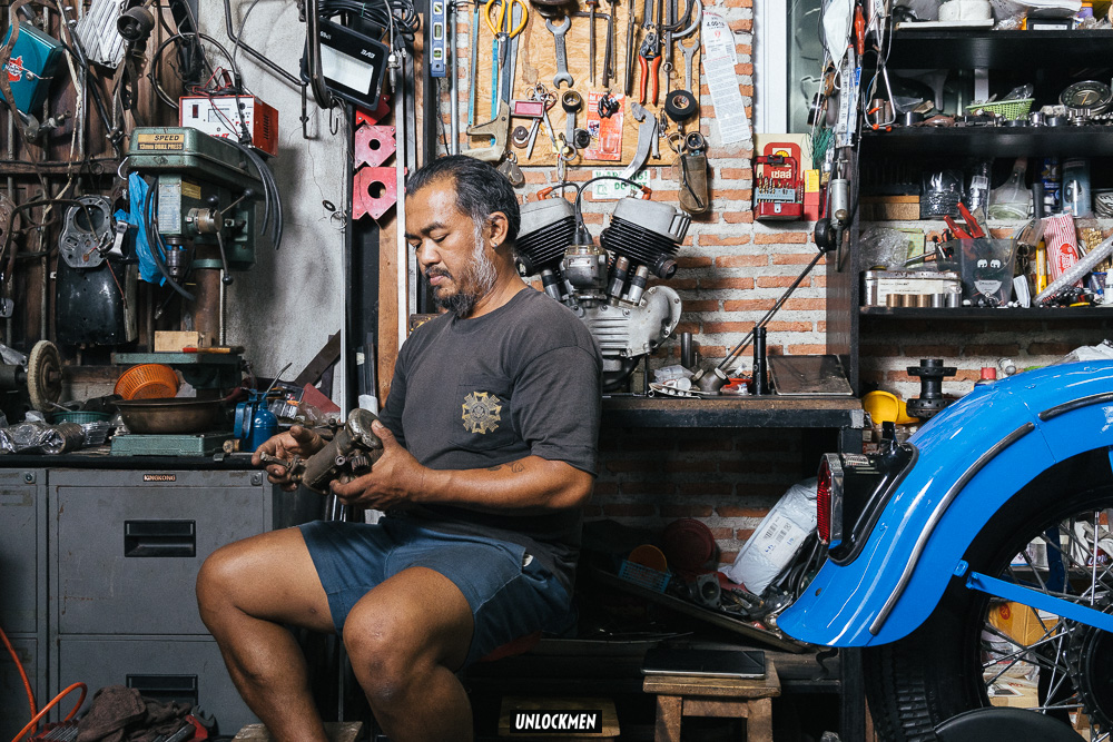 ช่วงนั้นประมาณอายุ 18 ได้ คือรถพวกนี้มันหาร้านซ่อมยาก เราก็เลยลองทำเองดู ขี่ไปซ่อมไปประมาณนี้ครับ ค่อย ๆ ศึกษาไปเรื่อย ๆ ตอนซ่อมครั้งแรกคือขับรถไปลุยน้ำท่วมแล้วรถดับ มันก็เริ่มมาจากตรงนั้นเลย”