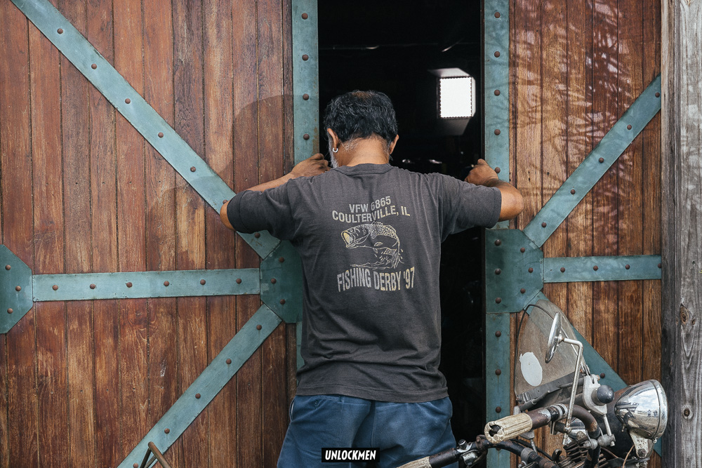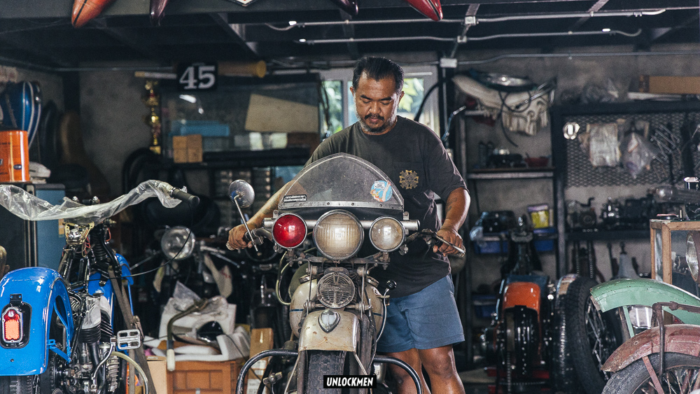 “ตอนนั้นผมเล่นดนตรีกลางคืนอยู่ ผมจะซื้อรถมอเตอร์ไซค์ทั่วไปแต่พ่อไม่ให้ซื้อ ผมก็เลยเอาเงินไปซื้อรถโบราณมาเลยโดยยังไม่บอกเขา พอซื้อมา พ่อออกมาเห็น คำแรกที่พ่อพูดคือ ‘ซื้อมาทำไมรถจับกัง’ รถที่ผมซื้อคือ MZ ทรงหยดน้ำ ตอนนั้นผมก็งงทำไมพ่อพูดอย่างนั้น พ่อเลยขึ้นบ้านไปเอารูปสมัยก่อนตอนขี่รถอังกฤษมาให้ผมดู