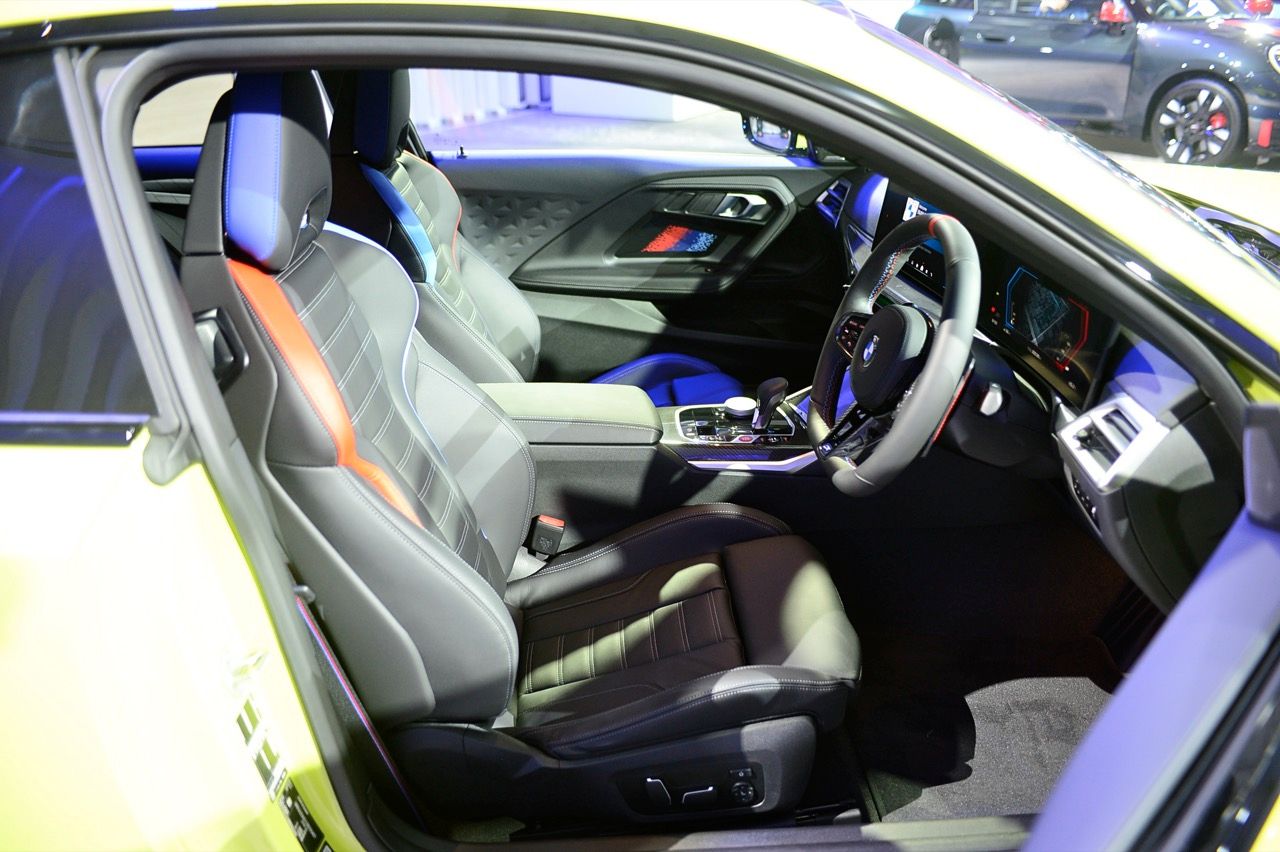 ห้องโดยสาร ติดตั้งพวงมาลัยคาร์บอนแบบท้ายตัด ชุดแป้นเกียร์ด้านหลัง เบาะนั่ง M Sport ชุดแต่ง M Carbon Fibre ไฟสัญลักษณ์ M ที่มือจับประตู รุ่น M Racetrack ตัวท็อป เปลี่ยนเบาะหน้าเป็นแบบ M Carbon bucket seat ระบบช่วยการขับขี่และการควบคุมทั่วไปนั้น M2 มีแพ็คเกจ BMW Live Cockpit Professional ติดตั้งมาเป็นอุปกรณ์มาตรฐาน รวมถึงระบบช่วยเหลือผู้ขับขี่แบบครบชุด