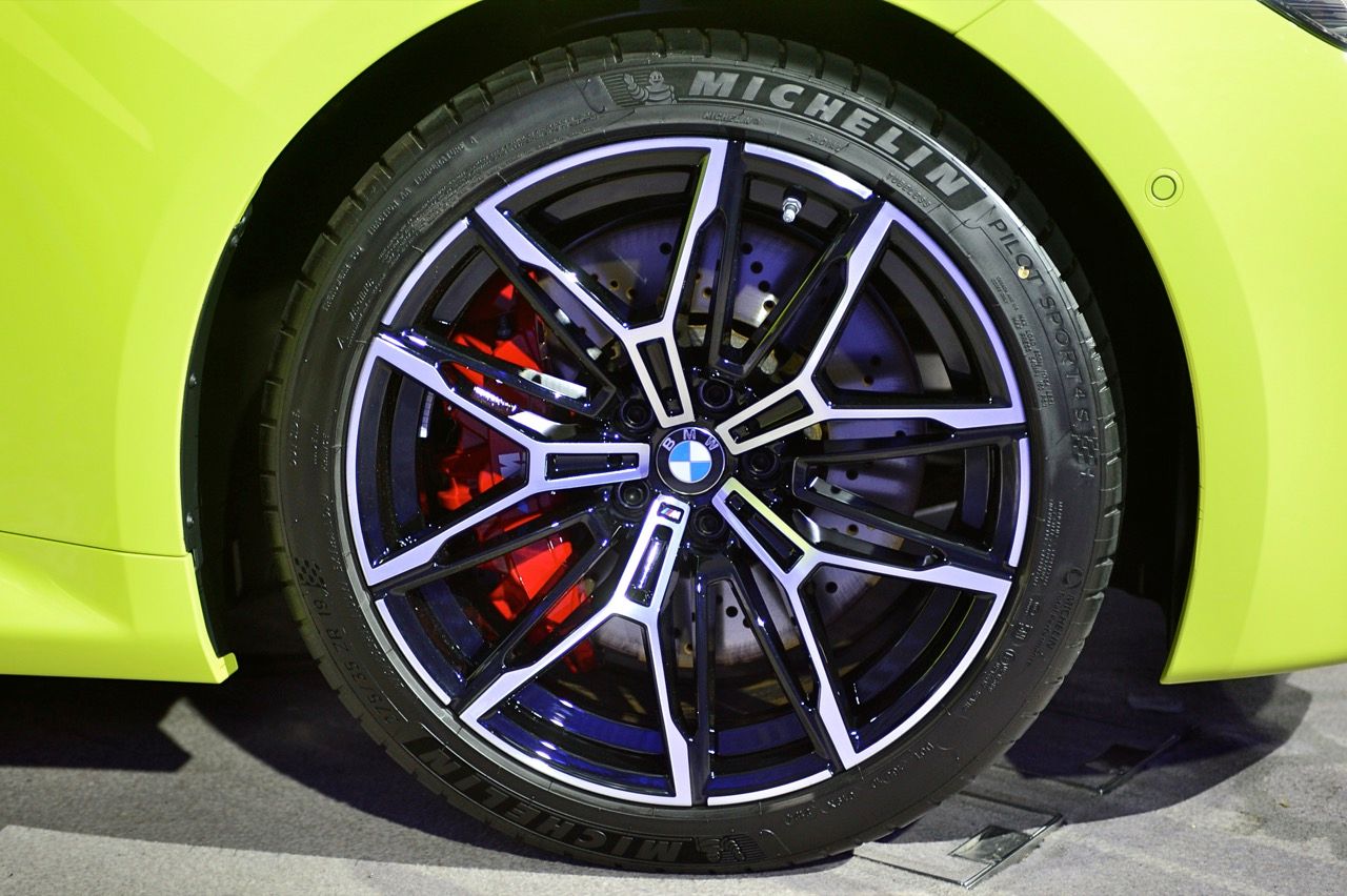 ด้านข้าง ซุ้มล้อบึกบึนคู่กับขอบประตูล่างที่ยื่นออกเล็กน้อย ล้อมกรอบล้ออัลลอย M น้ำหนักเบา ขนาด 19 นิ้ว (หน้า) / 20 นิ้ว (หลัง) แบบ double-spoke มีให้เลือกทั้งสีเงิน สองสี และสีดำ Jet Black กันชนท้ายติดตั้งดิฟฟิวเซอร์สไตล์รถแข่ง ชุดท่อไอเสียคู่สีดำ หลังคาแบบคาร์บอน